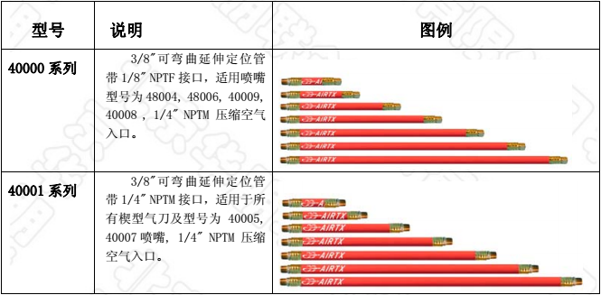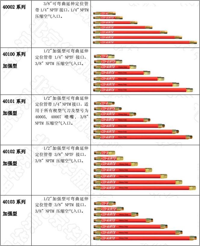 AiRTX可彎曲延伸定位管,采用獨(dú)特設(shè)計,可以把壓縮空氣送到任何您需要的、難以到達(dá)的地方。您可以根據(jù)需要,選擇3/8"軟管內(nèi)置5/32"銅線或加強(qiáng)型1/2"軟管內(nèi)置7/32"銅線的可彎曲延伸定位管。