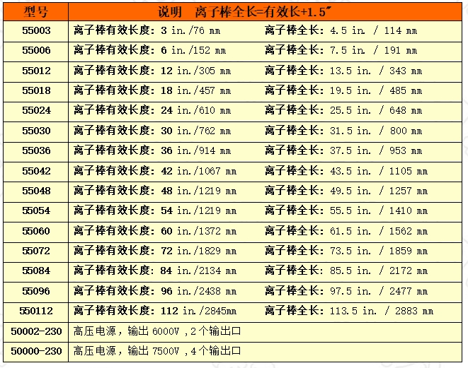 根據(jù)離子棒長度選型,型號的后兩位為離子棒的有效長度,單位為英寸(1英寸=25.4mm)。