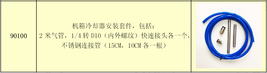 溫控型機(jī)箱冷卻器套件包括:機(jī)箱冷卻器,8英尺長(zhǎng)的導(dǎo)管套件(冷空氣分配器),電磁閥,溫度傳感器,5微米的自動(dòng)過(guò)濾器。所有項(xiàng)目都可單獨(dú)選配。