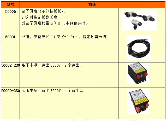 離子發(fā)射端與一個高壓(6000V)、低電流的50002型埃泰克電源結(jié)合,正、負離子由電極發(fā)射出來,用壓縮空氣攜帶噴射到遠距離目標物體。離子風嘴的有效工作距離是5英尺(1.5m)。