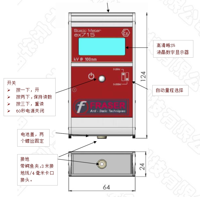 英國FRASER EX715防爆靜電測試儀,手持非接觸式測量物體及材料表面靜電電壓,適用于危險區(qū)Zones1及2。
